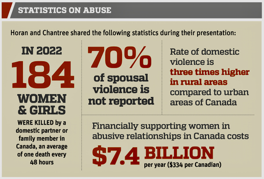 A report from the Canadian Centre for Justice and Community Safety Statistics was presented to the House of Commons Standing Committee on the Status of Women last year. It states that the rural rate of reported intimate partner violence against women is 598 per 100,000 population in Ontario, compared to 378 per 100,000 in urban areas. These numbers are for reported incidents, and Chantree said it’s known that nearly 70 per cent of spousal violence goes unreported.