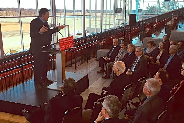 Ontario Finance Minister Charles Sousa announces the province's next horseracing sector funding agreement March 23 at Hamilton's Flamboro Downs. (OntarioRacing.com)