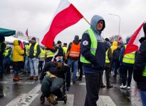 Polish farmers block the road to the border crossing during a protest in Okopy