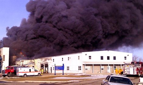 U.S. firm Grain Millers Inc. plans to process flax at Angusville, Man., where the former Glanbia Nutritionals flax plant suffered $7 million in damages in this blaze in March 2012. (RCMP photo)