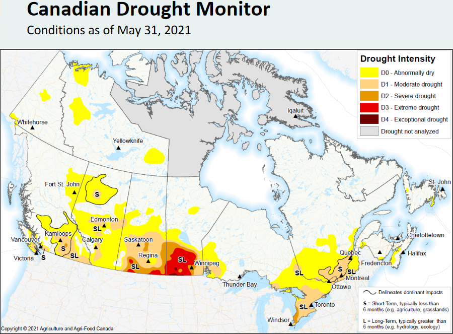 Canadian Drought Monitor – Significant precipitation through the month of May relieved drought conditions across parts of the Canadian Prairies, while other areas remained significantly dry, according to the latest assessment from the Canadian Drought Monitor as of May 31.