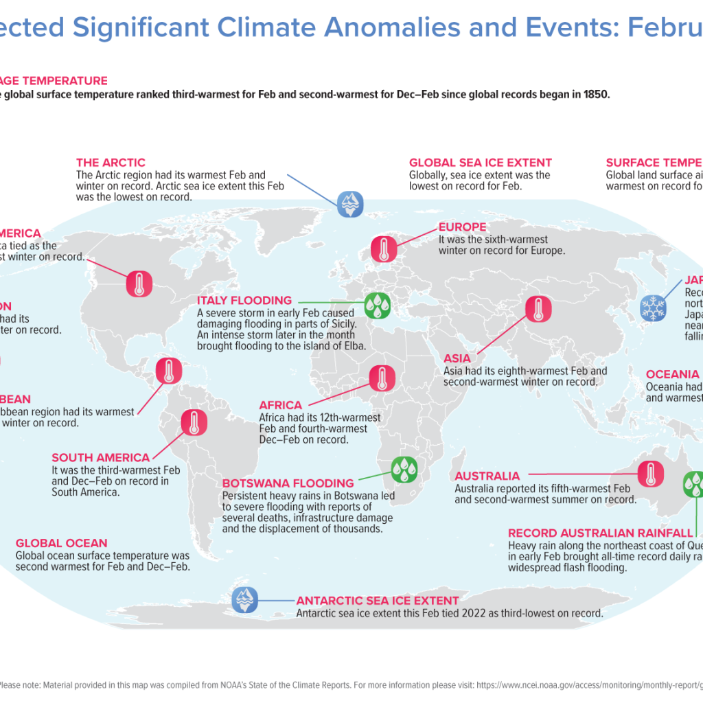 It was the fourth-warmest February for the global land air temperature and the second-warmest February for the global ocean surface temperature. Global temperatures have cooled in recent months as a La Niña episode, the cold phase of El Niño Southern Oscillation (ENSO), developed. Global temperatures tend to be cooler during periods of La Niña in comparison to periods with an El Niño present.