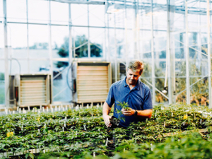 <p>Horticulture professor Larry Smart examines industrial hemp plants growing in a greenhouse at Cornell AgriTech in Geneva, New York. Photo: Justin James Muir/Cornell University</p>