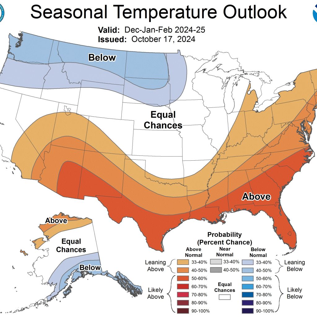 The 2024-2025 U.S. Winter Outlook map for temperature shows the greatest chances for cooler-than-average conditions in the Pacific Northwest of the U.S. (Image credit: NOAA)