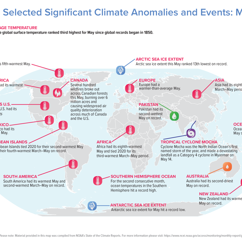 A map of the world plotted with some of the most significant climate events that occurred during May 2023. (Image credit: NOAA/NCEI)