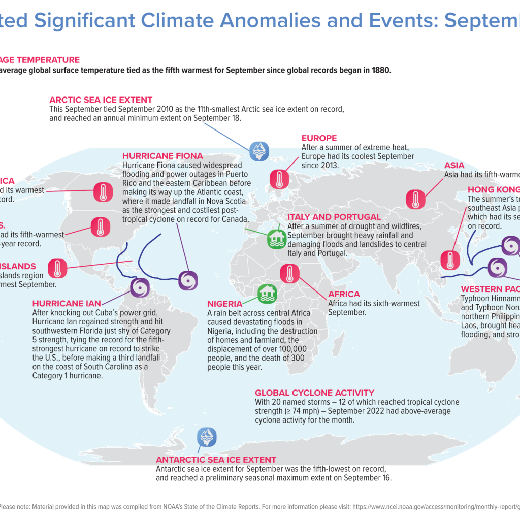 A map of the world plotted with some of the most significant climate events that occurred during September 2022. Photo: NOAA