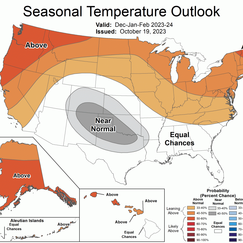 The greatest odds for warmer-than-average conditions are in Alaska, the Pacific Northwest and northern New England. Near-normal seasonal mean temperatures are most likely for a region from the south-central Rockies to the southern Plains. Remaining areas fall into the category of equal chances for below-, near-, or above-average seasonal mean temperatures.